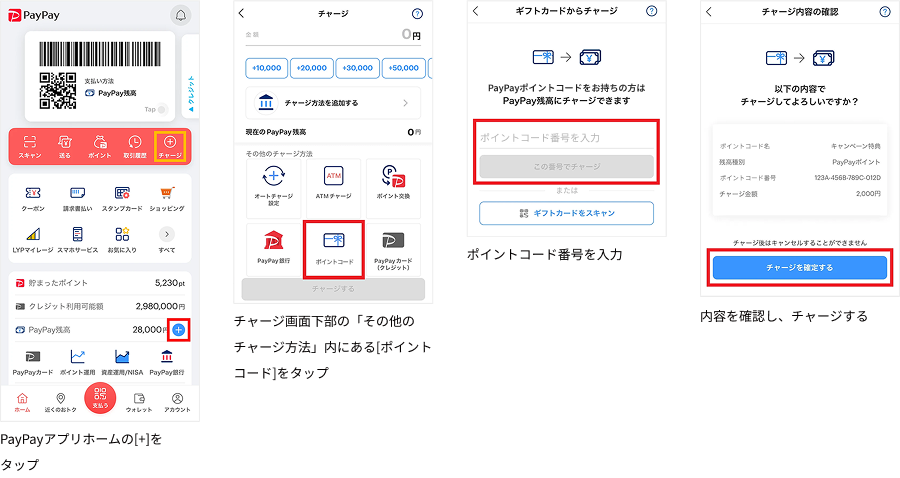 ●ポイントコードURLでのチャージがうまくできない場合は、PayPayアプリの「チャージ」内の下部にある「ポイントコード」より、ポイントコード番号を⼊⼒のうえお受け取りください。